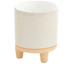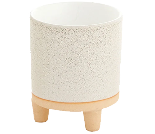 The modern Bubbled Ceramic Footed Pot offers a unique two-tone finish, with a bubbled white finish on top and smooth cream color on the base and feet. Made to fit a 3″ drop-in pot. (plant and gravel not included)