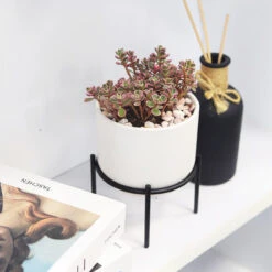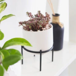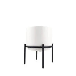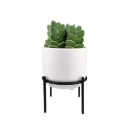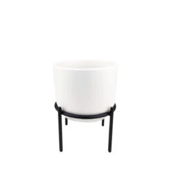 Presenting our stylish 4-inch ceramic planter set in a classic solid white finish. These versatile planters are perfect for showcasing your indoor plants as cache pots, allowing you to easily switch out plants as desired. The set includes a sleek black metal stand, which is separate from the container, adding a modern touch to your plant display. With their compact size and elegant design, these planters are a must-have for any plant lovers seeking a sophisticated style for their office or living spaces.