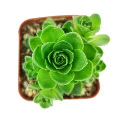 Aeonium aureum greenovia, often known as Mountain Rose or Green Rose Buds, is a lovely succulent with a solitary rosette of pale apple-green leaves. The rosette can reach a diameter of 10 inches (25 cm). In the winter, the simple leaves flush out, and in the summer, they close up into compact, rounded balls. A stiff, erect inflorescence of bright yellow blooms is produced by mature plants.