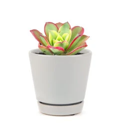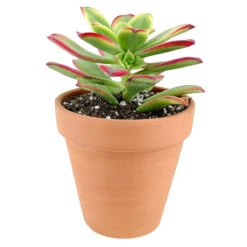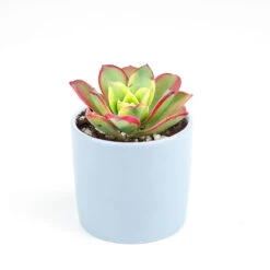 Aeonium Percarneum (Aeonium “Kiwi”) is a drought tolerant succulent with branches of variegated, pointed leaves. Its leaves can have up to 4 colors when grown in ideal condition: green, yellow, white, and red. It grows up to 8 inches and produces bell-shaped flowers in winter. It goes dormant in the summer and grows best in cool shade/ winter time.