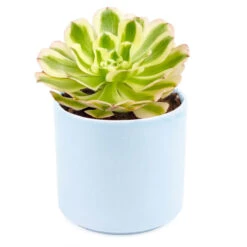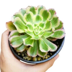 Aeonium Luteovariegatum – Aeonium Arboreum ‘Luteovariegatum’ is a winter growing succulent that forms large rosettes of variegated green and white leaves with vibrant coppery red margins. These rosettes are usually connected to stalks of up to 18 inches tall.