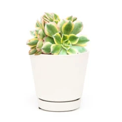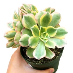 Aeonium Sunburst as known Copper Pinwheel – It has large rosettes of variegated green and white leaves edged in bright, coppery red that stand up on stalks to 18 inches tall. Nice houseplant in bright area.