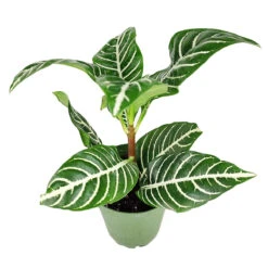 The Zebra Plant features large, glossy, dark green leaves marked with bold, white, and sometimes yellowish veins that create a dramatic contrast, making it a popular choice among plant enthusiasts and interior decorators.