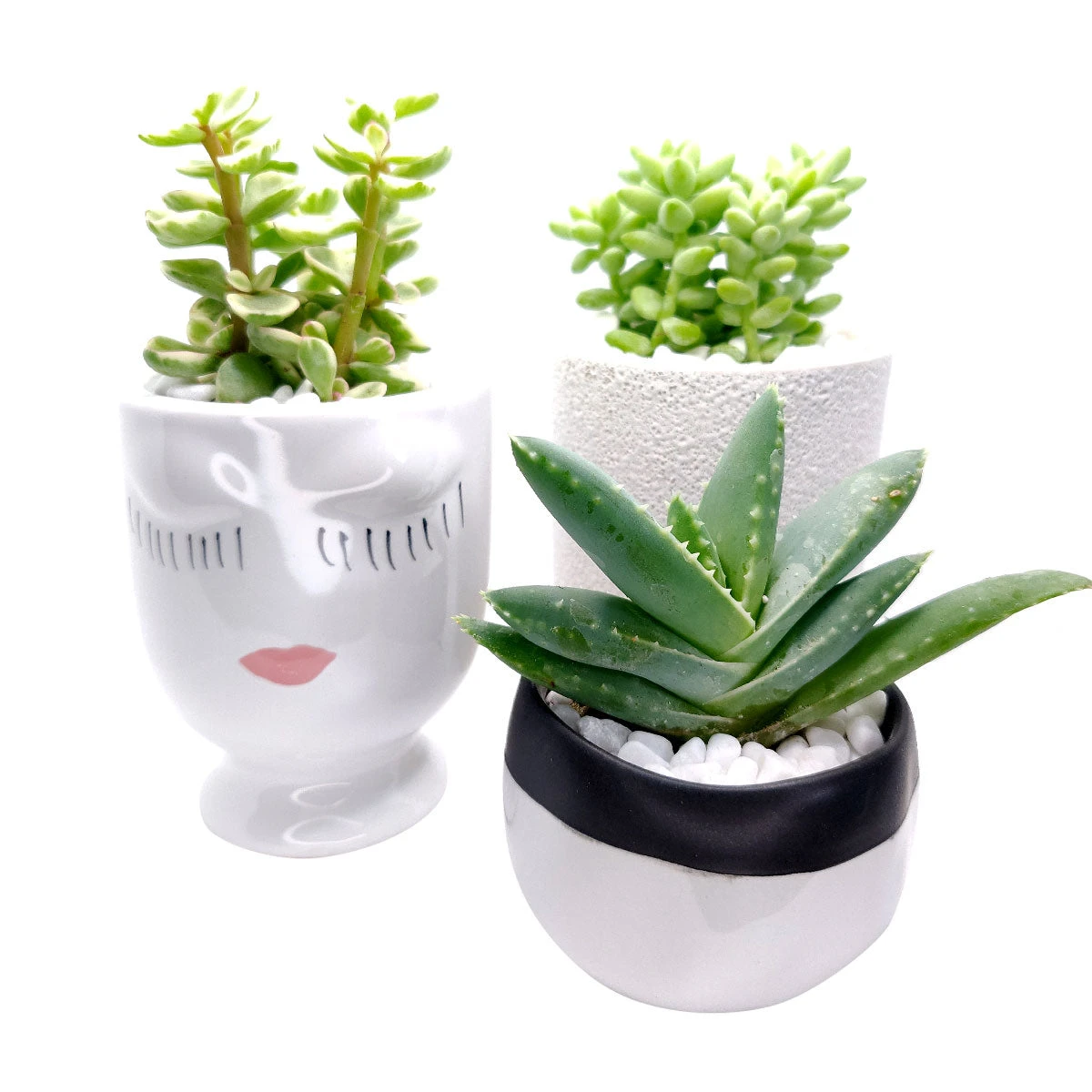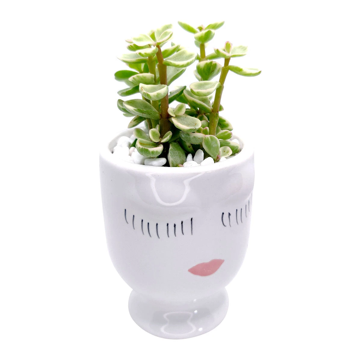 The unique artistic Lady Face Pots are a fun way to enhance your living or office space. Your favorite succulents act as the character’s hair, which allows each piece to be re-designed with a whole new look in seconds if you desire. Drop-in Size: 2 inches. (plant and gravel not included).