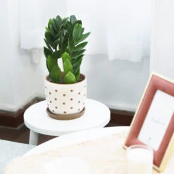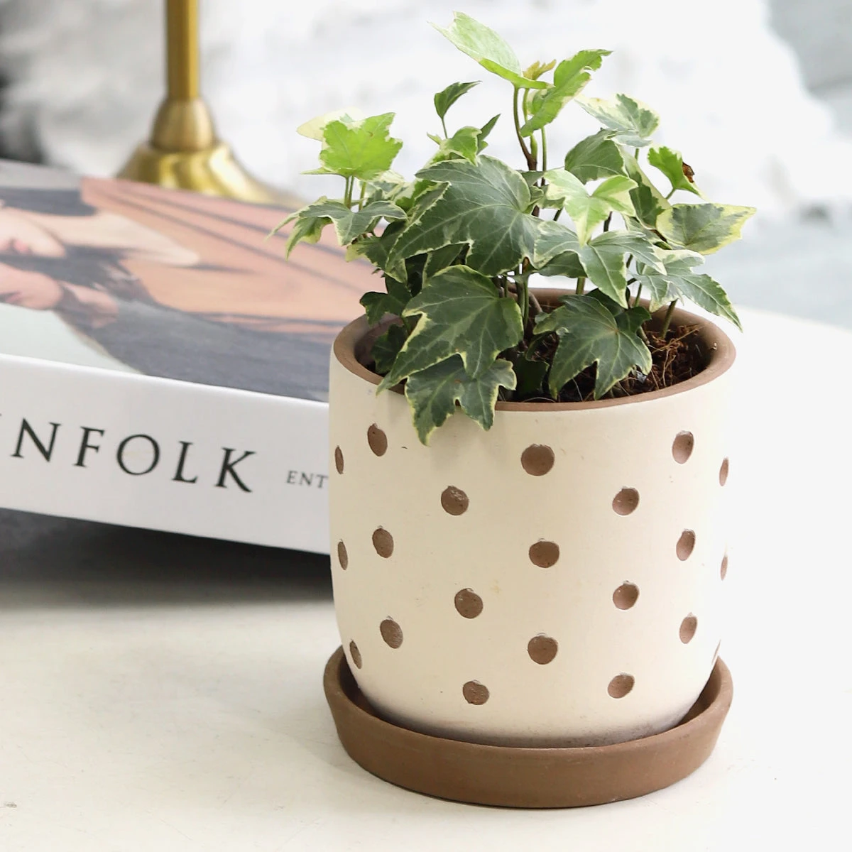 The timeless beauty of polka dot pattern with a modern twist! This elegant and sophisticated terracotta pot features a white base adorned with charming clay-colored lovely polka dots. The stunning contrast of the two colors creates a captivating centerpiece that adds an instant touch of style to any home decor.