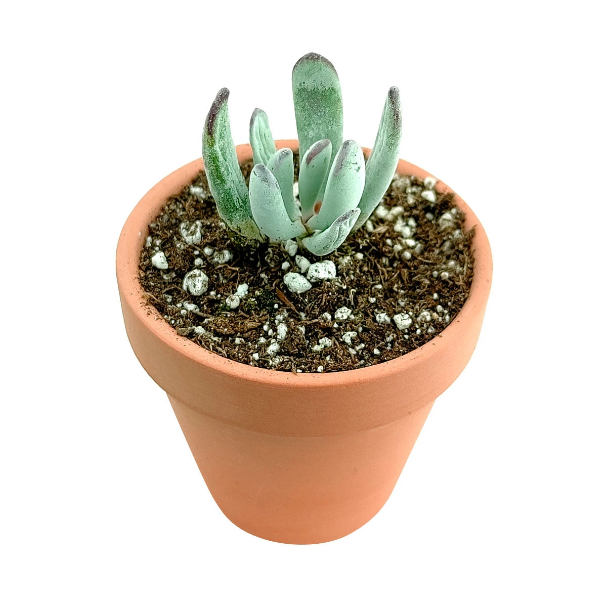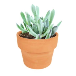 Cotyledon orbiculata var. flanaganii is an erect, succulent shrub up to 34 inches (75 cm) tall. The leaves are spirally arranged, powdery gray-green and up to 6 inches (15 cm) long.