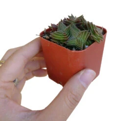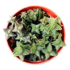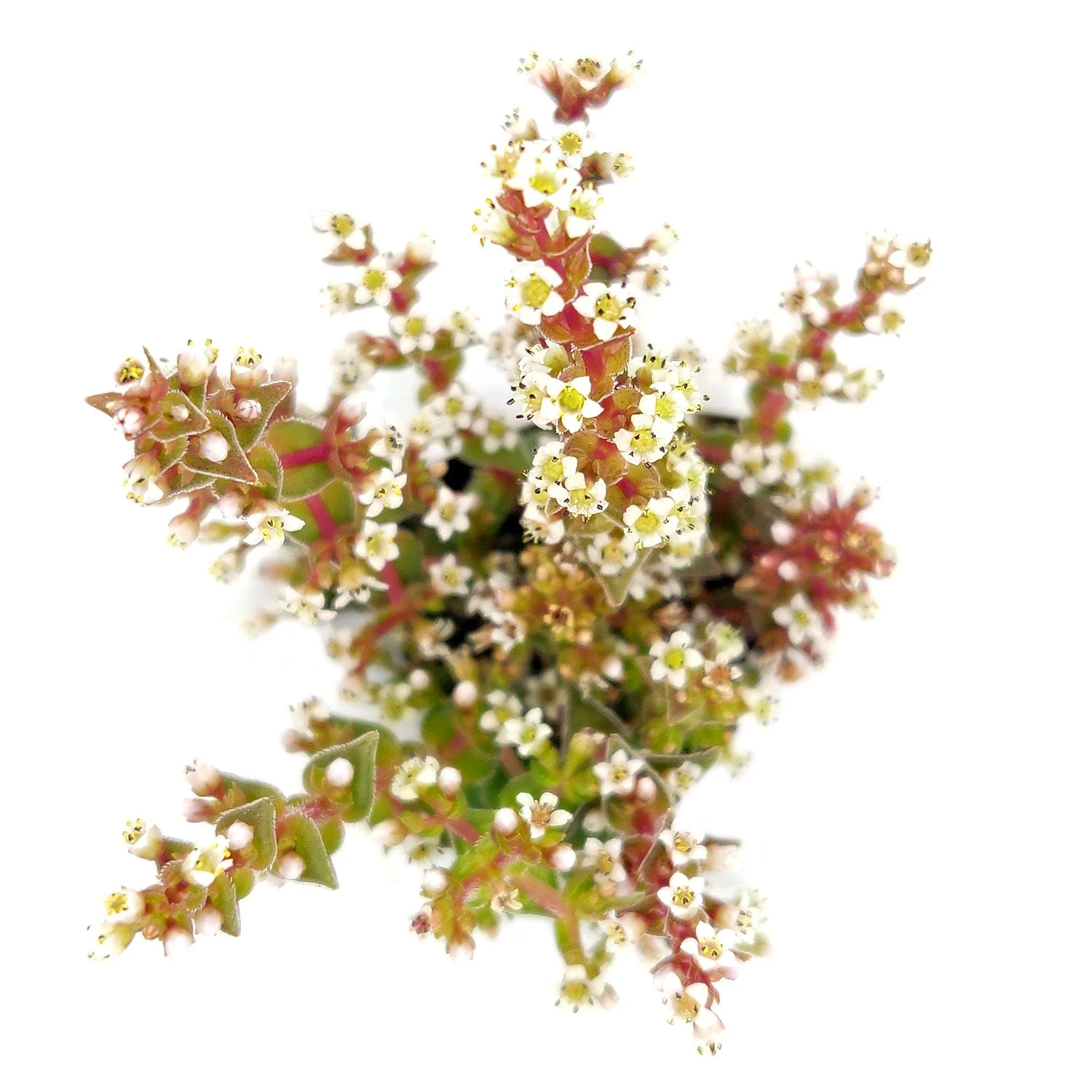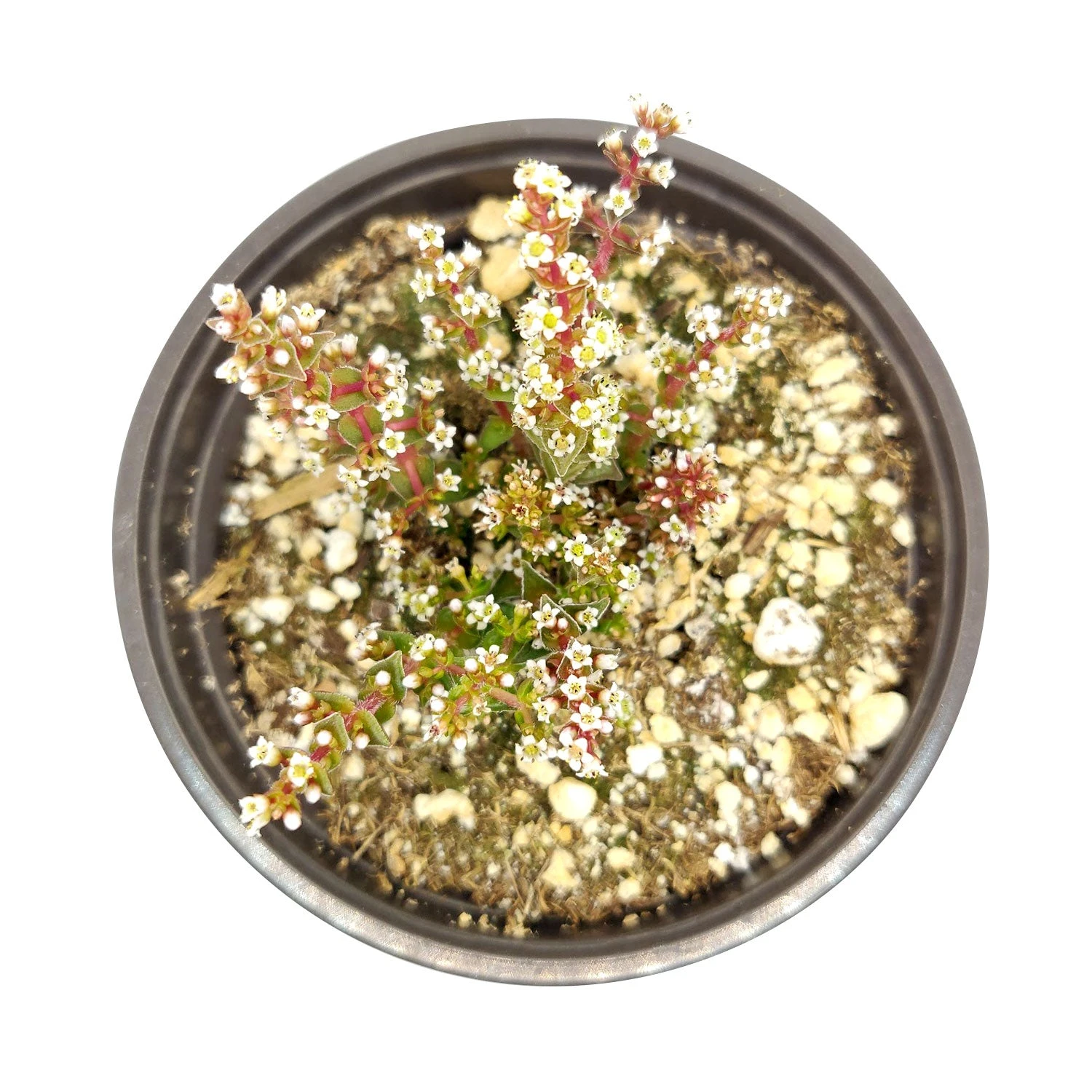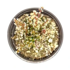 Crassula Capitella Subsp. Thyrsiflora ‘Pagoda Village’ is a rare succulent that grows tightly stacked triangular leaves, resembling the shape of a pagoda. The branches can grow up to 10 inches long. Unlike Crassula Shark Tooth/ Red Pagoda, Crassula Pagoda Village has leaves that are flatter and grow a bit downward. The foliage has shades of red, purple and green. Crassula Capitella Subsp.