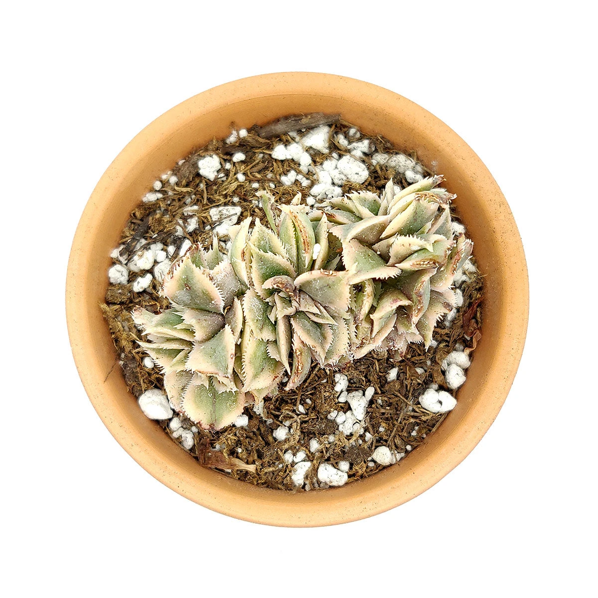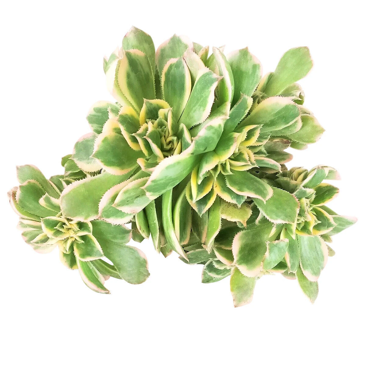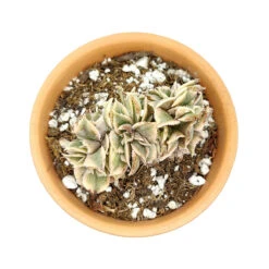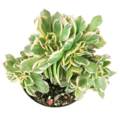 CRESTED Aeonium Sunburst is a very rare and attractive succulent. It is similar to the regular Aeonium Sunburst in term of color. Its crested form also has variegated white, yellow, and green leaves that can develop red edged if grown under bright light.