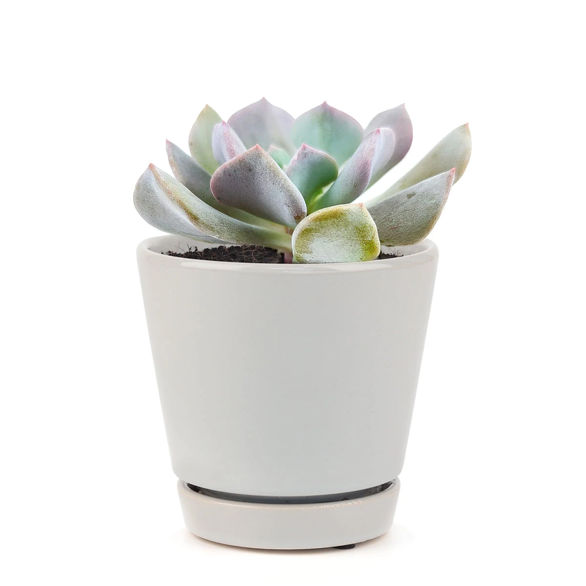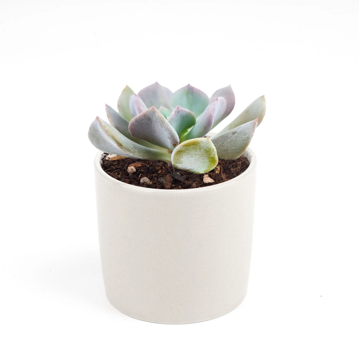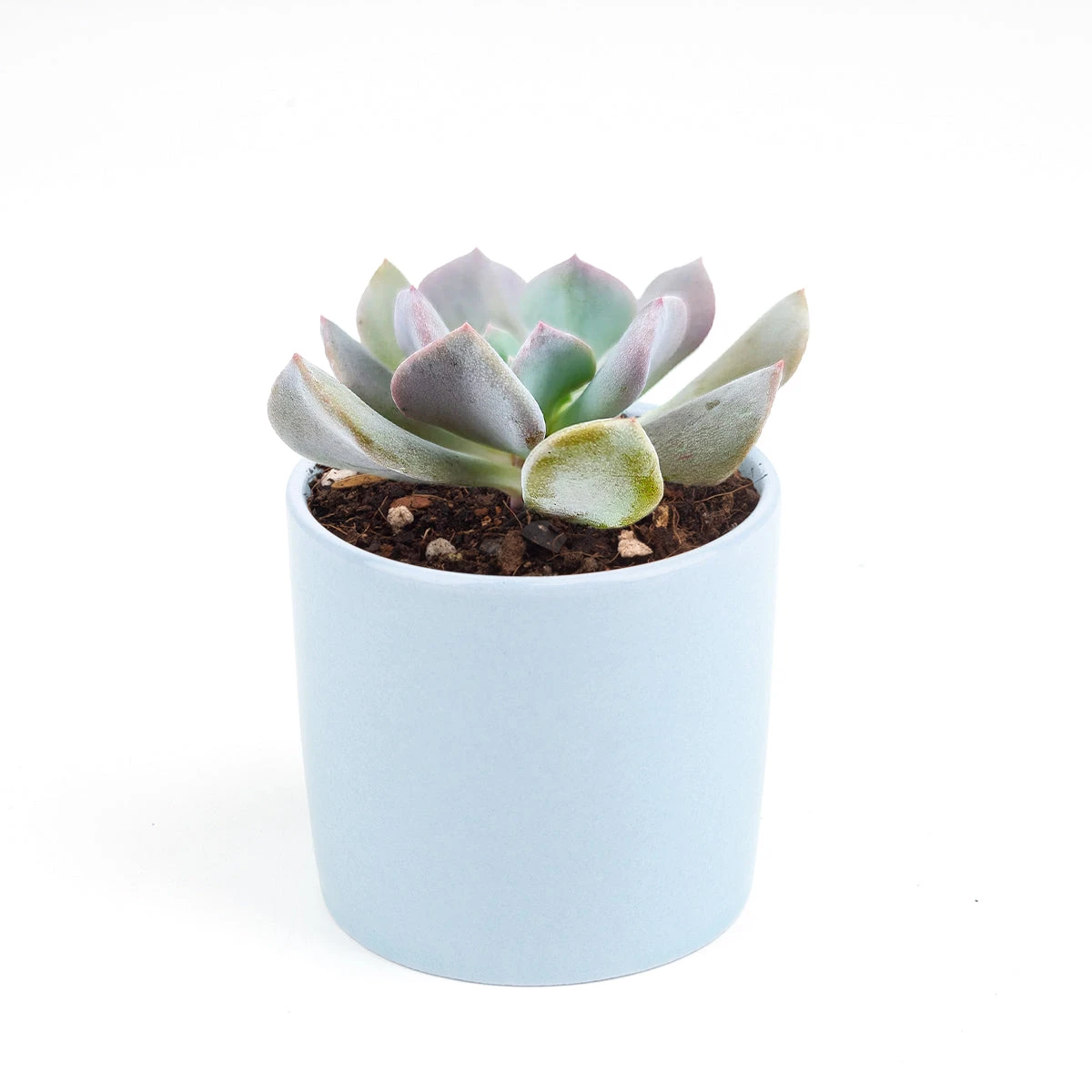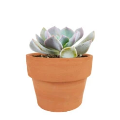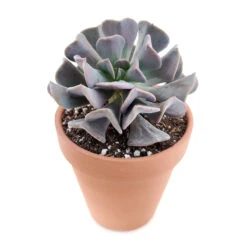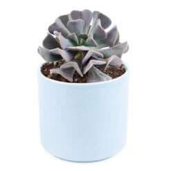 Echeveria Cubic Frost is a stunning succulent with silver coated lilac leaves that turn baby pink with lots of sun exposure. The leaves are distinctively upturned, pointy, symmetrical, and fleshy. This species grows quickly and can produce offsets freely, creating attractive clusters of lavender rosettes that can get up to 10 inches in diameter.
