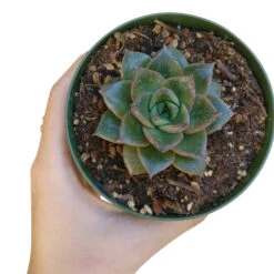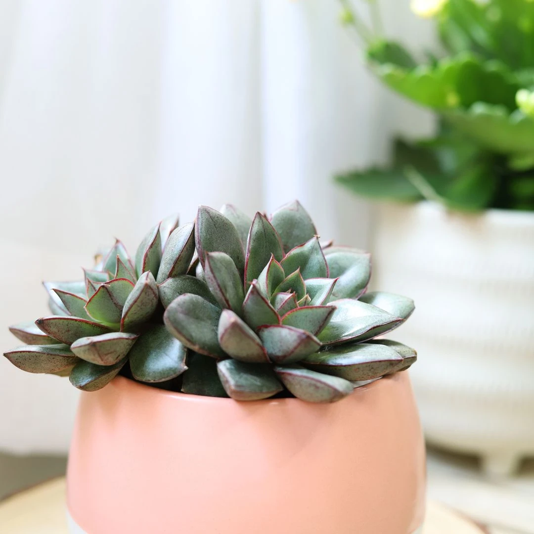 Echeveria Purpusorum Rose A.Berger is a striking echeveria with deep olive green leaves embellished by small brownish red spots. The leaves are pointy and don’t have the white powdery coat like other Echeverias, making this species have a firmer and less fragile look. The rosettes can grow up to 3.1 inches in diameter.