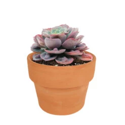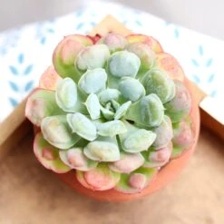 Echeveria Raindrops is an unusual succulent that has little globular bumps near the tips of its light green leaves. The bumps and tips of the leaves can turn pink or red in cold weather and bright light. Echeveria Raindrops can grow up to 6″ wide.