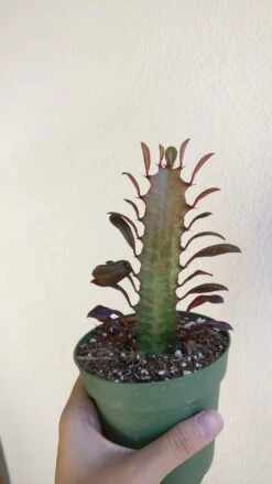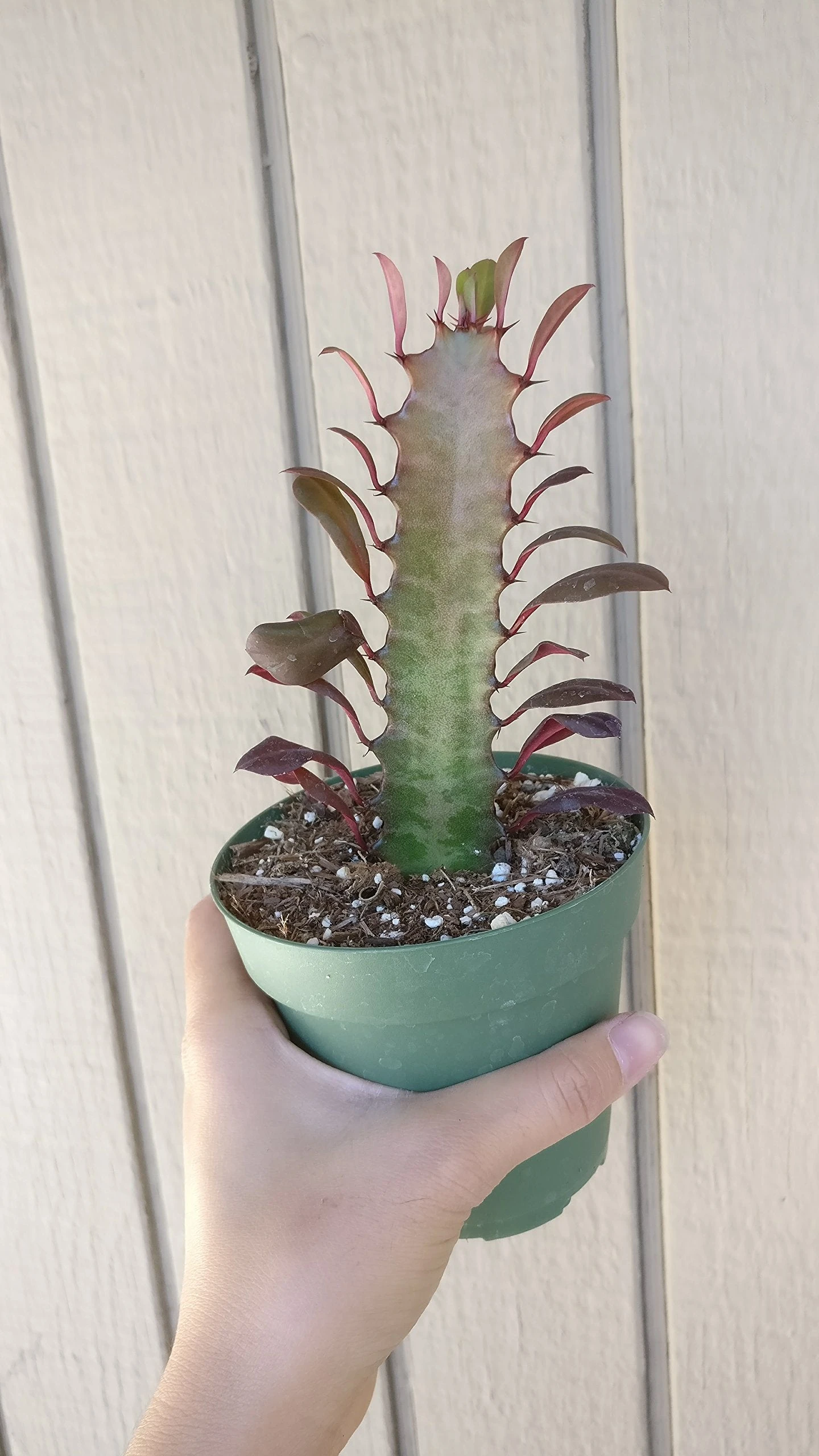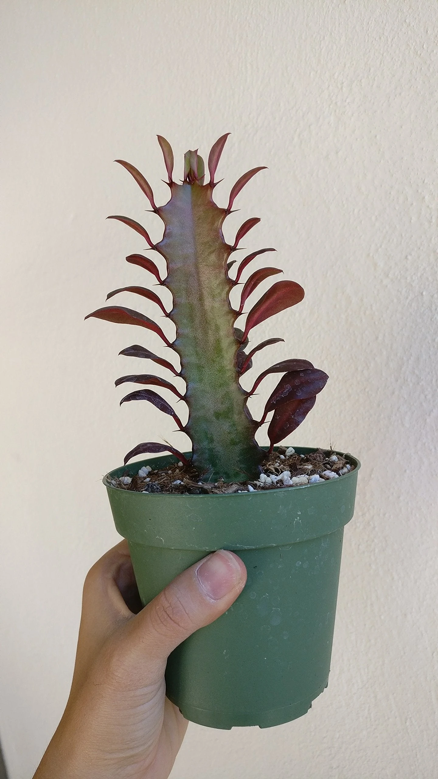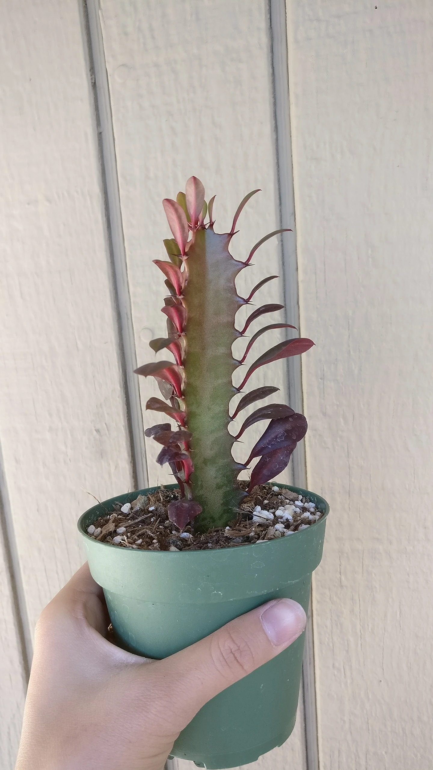 Euphorbia Trigona f. Rubra is native to Africa. It is an unusual succulent that is often mistaken for a cactus because of its interesting shape and short sharp spines. They have stems that are triangular and leaves shaped like teardrops.