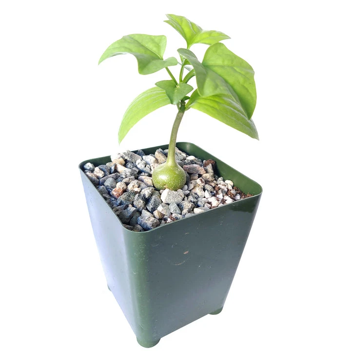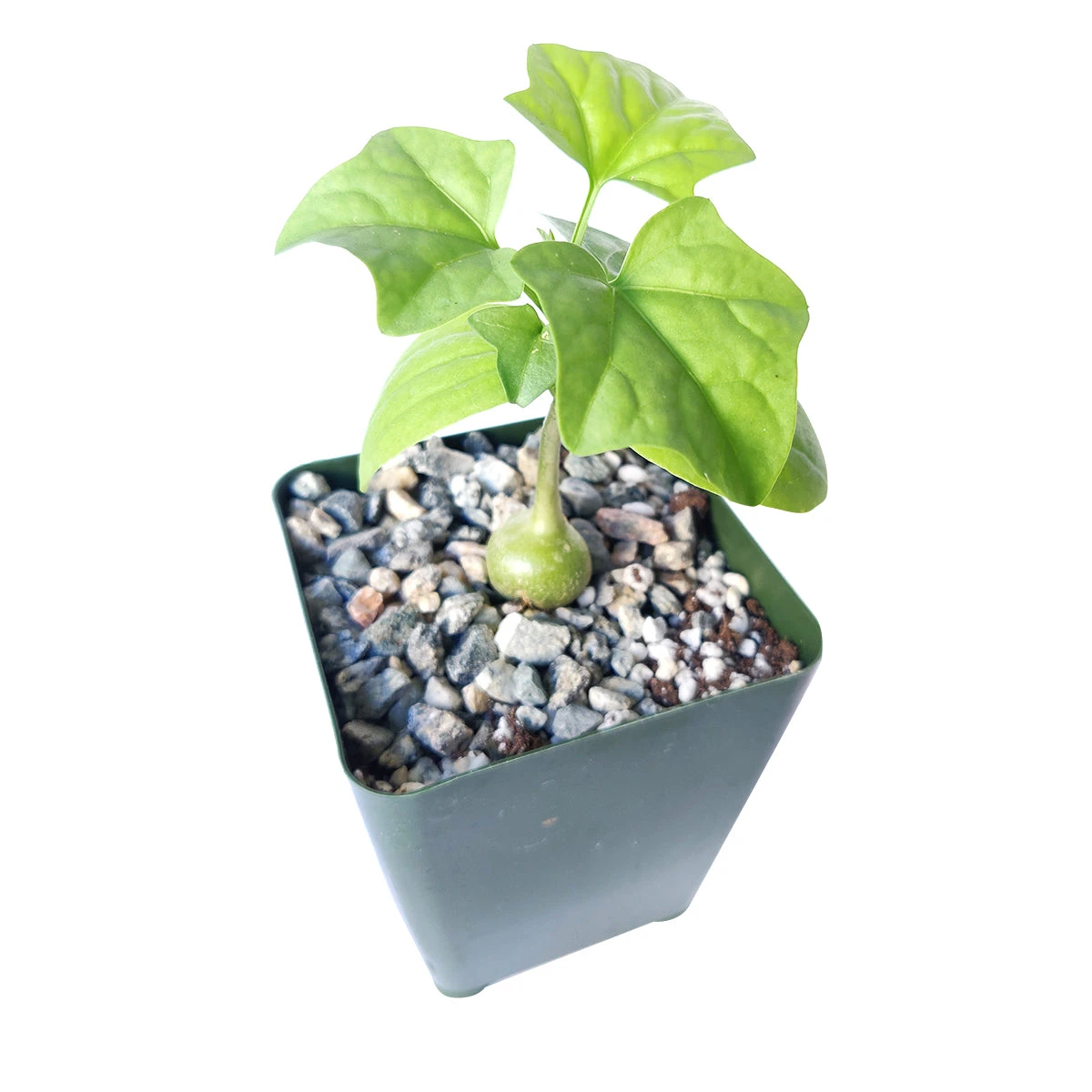 Gerrardanthus macrorhizus, also known as bigfoot, is a rare species of plant native to southern Africa. It is a popular pot plant. It is a deciduous caudiciform vine in the cucumber family that forms a very large caudex up to 40″ in diameter. The caudex resembles a granite rock. The leaves are a medium dark green in an ivy-shaped form. Gerardanthus macrorhizus is dioecious, having male and female flowers on separate plants. The flowers are small orchid-like and golden yellow. It is one of the few caudiciform plants which do not need special greenhouse care and can be grown outside.