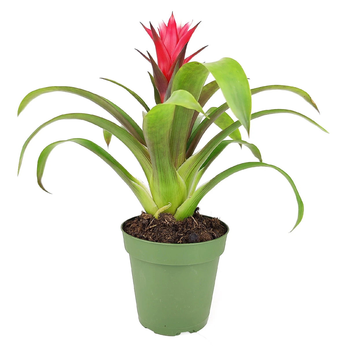 Guzmania hybrid red plant originates from Central and South America and belongs to the Bromeliad family, sharing its botanical kinship with unique plants like air plants, pineapples, and Spanish moss. In its native habitat, Guzmanias are epiphytes, meaning they grow upon other plants.