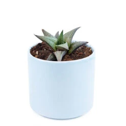 Haworthia venosa subsp. tessellata produces small rosettes of chubby triangular leaves with pale green web-like marking. The leaves are firm, recurved, and have sharp tips. The upper surface is firm, translucent and has tiny white teeth. The lower surface is rough and dark green. The leaves can turn reddish if grown under full sun.