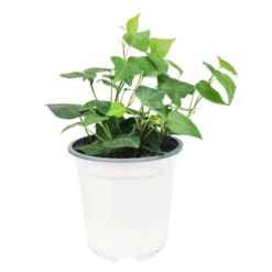 Ivy, or Hedera plant, is a vigorous, evergreen woody plant in the Araliaceae family. It has heart-shaped green leaves and tiny aerial roots that grow along the stems to help it climb. This plant is best seen cascading down from a hanging basket or container.