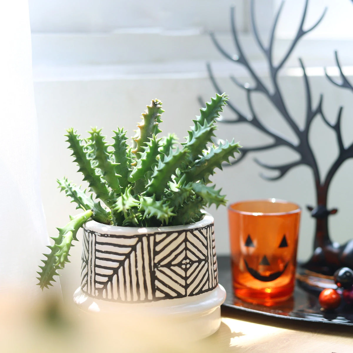 Rare succulent Orbea variegata, also known as Stapelia variegata, is a leafless, succulent perennial, up to 4 inches (10 cm) tall and up to 20 inches (50 cm) wide, with 4 angled, cactus like, toothed stems and highly variable, star-shaped, off-white or yellow flowers strongly speckled with maroon, up to 8 cm (3.1 in) in diameter.