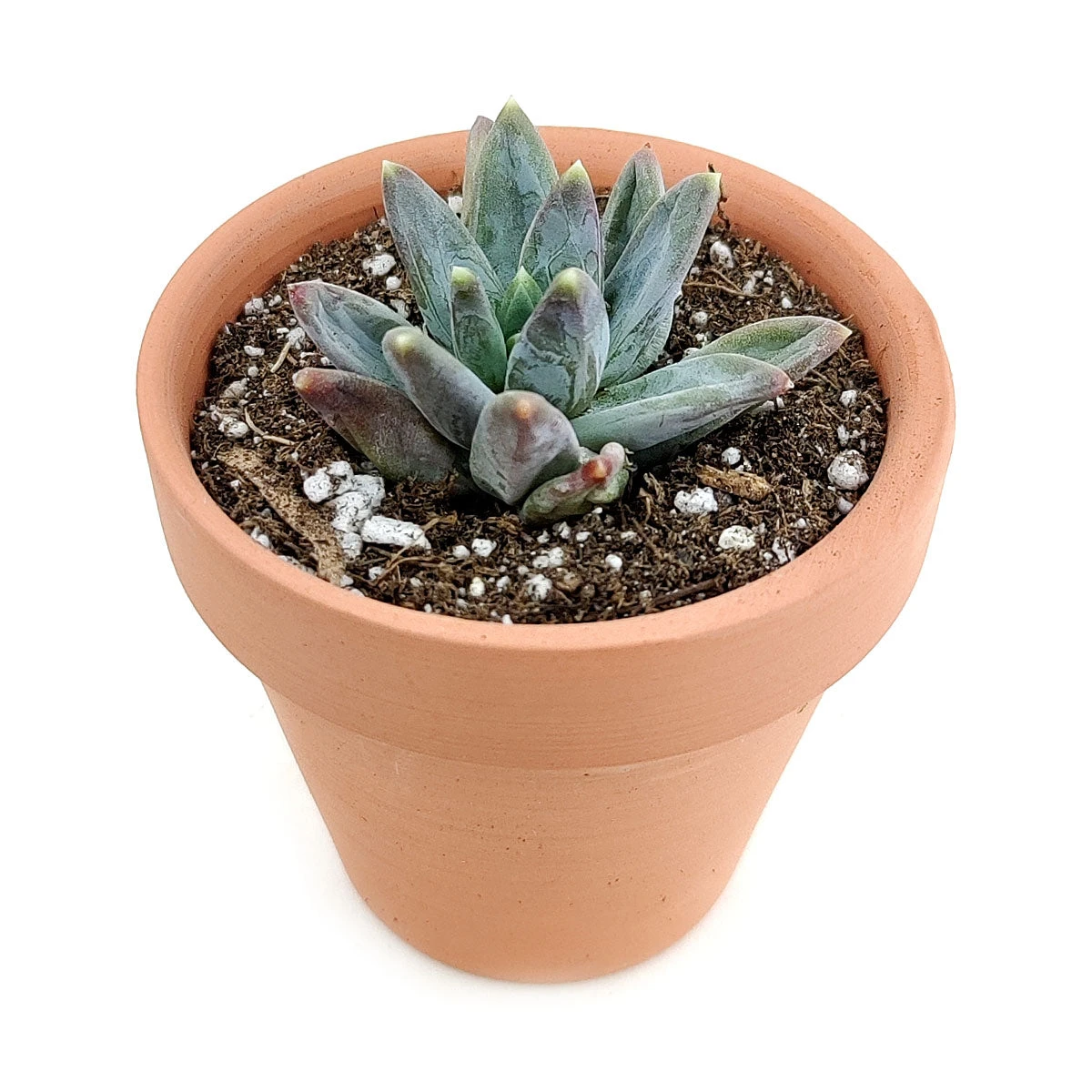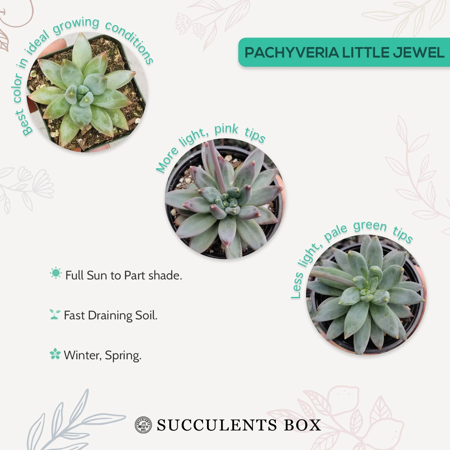 Pachyveria Compactum is a beautiful succulent with beautiful powdery blue gray pointed leaves that develop deep wine color tips in cold weather. The leaves have pretty white veins that resemble cuts on gemstones, hence its nickname “Little Jewel”.