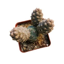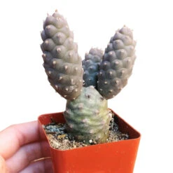 Tephrocactus articulatus var. inermis, also known as Pine Cone Cactus, is a spineless upright succulent with silver to powdery blue knobby stem segments that resemble pine cones. It grows up to 24 inches (60 cm) tall and spread 4 feet (1.2 m) wide. It produces small tufts with erect stems.