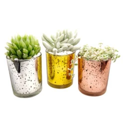 This pot is made of glass and painted in rose gold. It has no drainage hole therefore you can create a drainage layer by adding a medium such as pebbles, stones, or rocks to the bottom of a pot before adding soil.