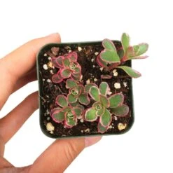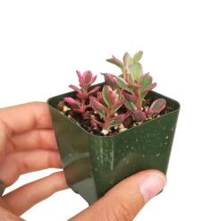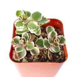 Sedum spurium ‘Tricolor’ (or Phedimus spurius ‘Tricolor’) is a variegated hardy succulent with white, green, and pink foliage. This rare plant has small and fleshy leaves with green center and white pink margins. In the summer, small star-shaped peachy flowers appear in clusters.
