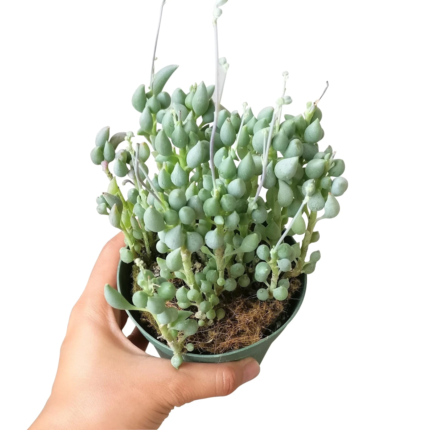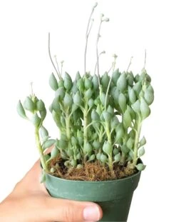 Senecio citriformis, native to South Africa, is a unique evergreen succulent with teardrop shaped leaves that point vertically. These leaves are grey-green in color and have transparent veins.
