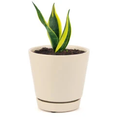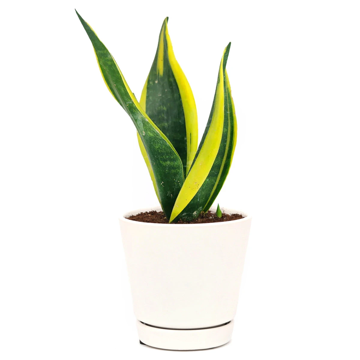 Sansevieria trifasciata Gold Flame is a variegated, hybrid Snake Plant species with sword-shaped dark green leaves and vertical bright yellow stripes. New leaves emerging from the center of the foliage are usually fully yellow. They gradually turn green, making this plant look like a burning flame, hence the name. Like other plants in the Sansevieria family, Gold Flame is very resilient and forgiving. It thrives even in low light spots and needs very little care.