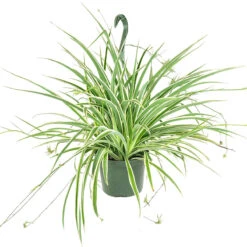 Chlorophytum comosum has long, thin green leaves with creamy yellow edges that can reach around 12 inches in length. This plant is especially suitable for hanging baskets and tall planters.