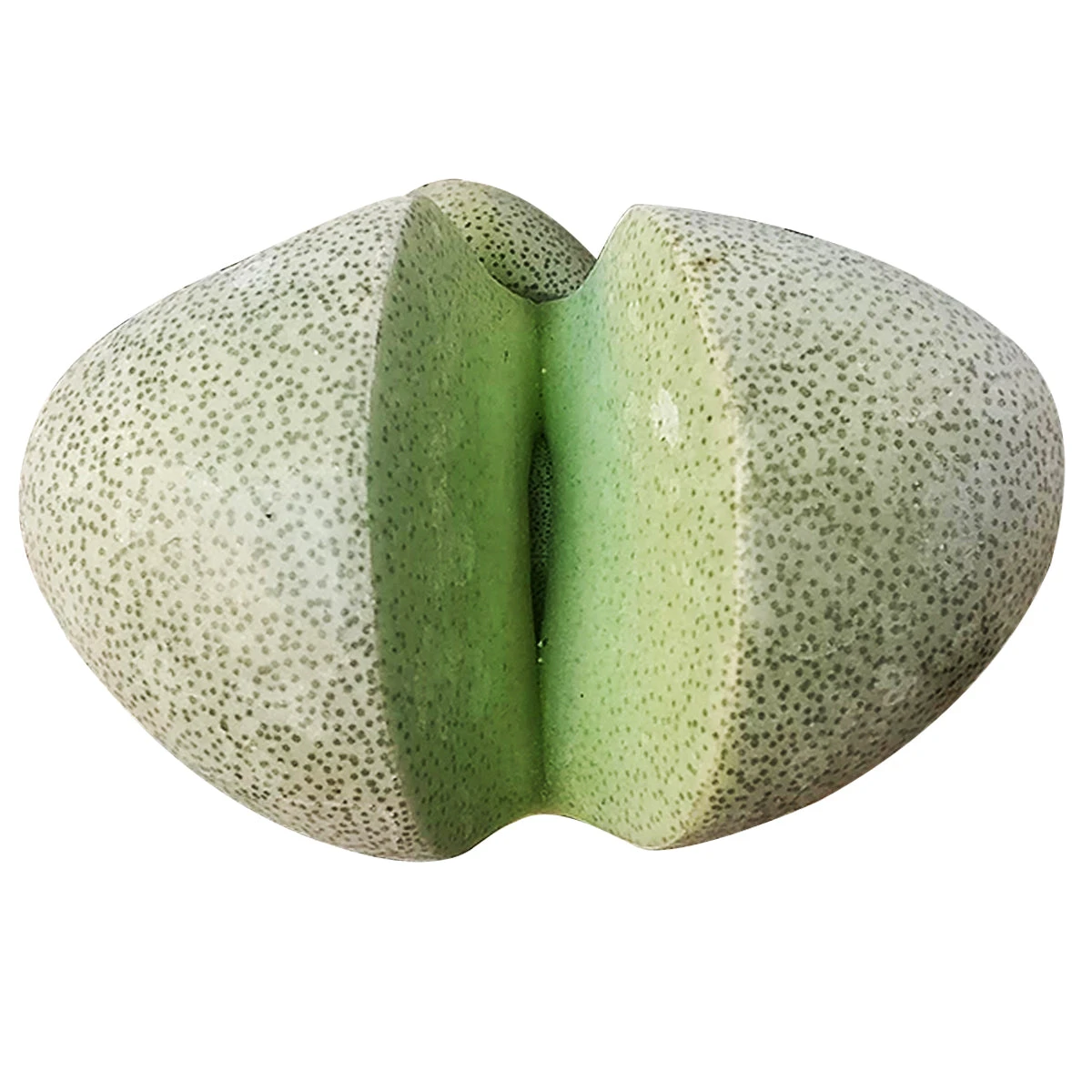 Pleiospilos nelii, also known as Split Rock, Cleft Stone, and Mimicry Plant, is a rare mesemb cultivar that resembles a piece of rock with green speckles as well as a straight cleft right down the middle. This stemless, perennial plant has one or two pairs of grey-green leaves, which will be replaced by a new pair every year.