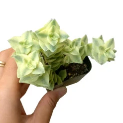 Crassula perforata ‘Variegata’ is a variegated form of Crassula perforata. This rare succulent grows and spreads out considerably fast into shrubs of up to 18 inches (46 cm) tall. The leaves are up to 1 inch (2.5 cm) long. Variegated leaves are gathered at the top of the plant and the lower leaves lose their variegation. It blooms with pale yellow flowers in spring.